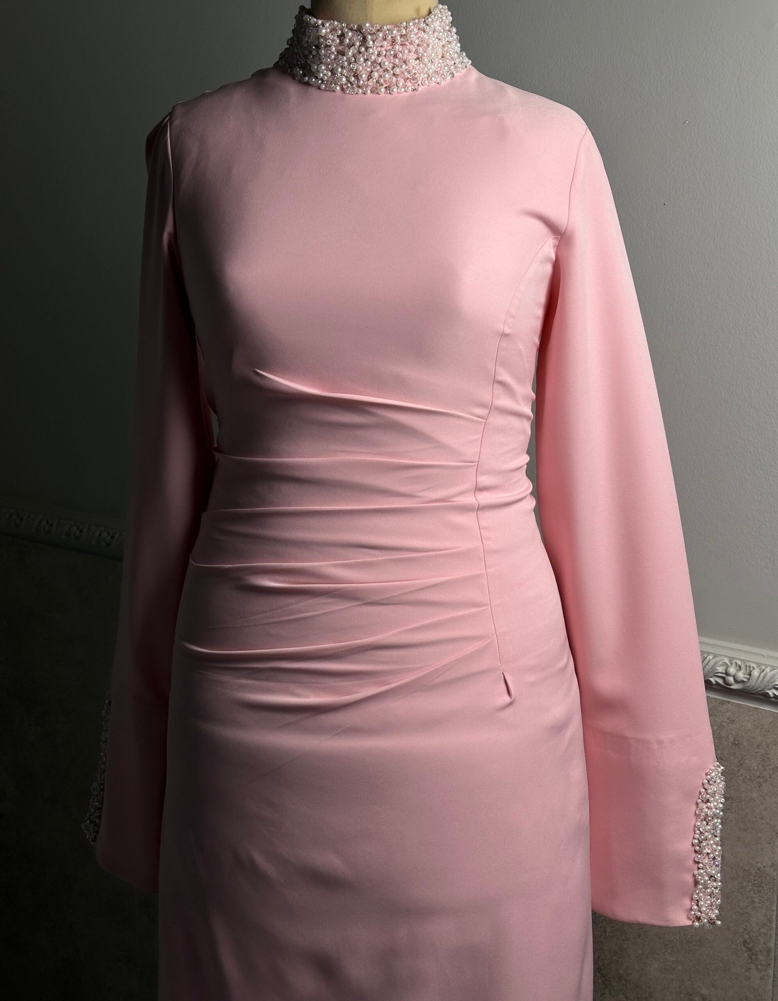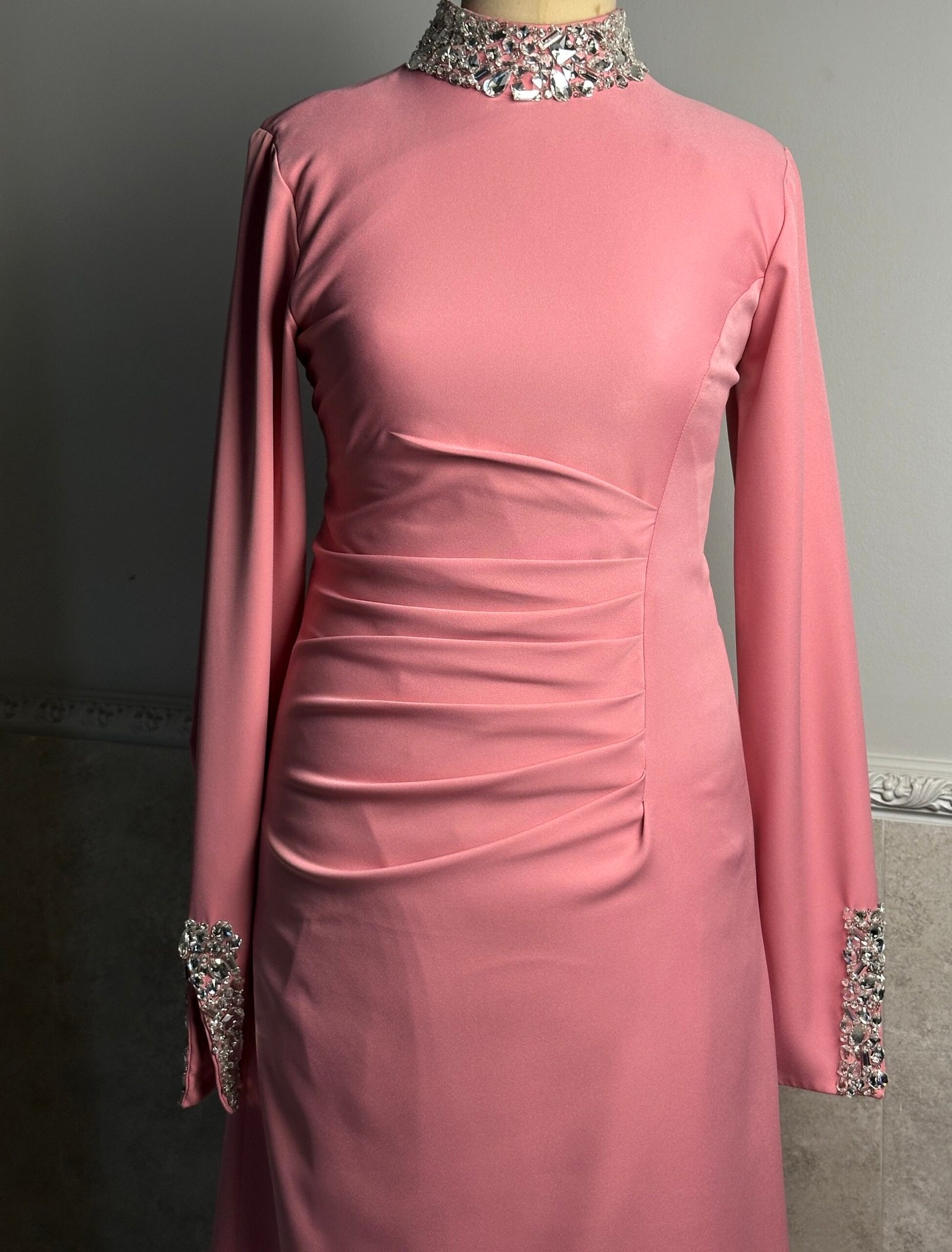 Dress with hand embroidered sleeves, crystal embroidered neckline and open cuff