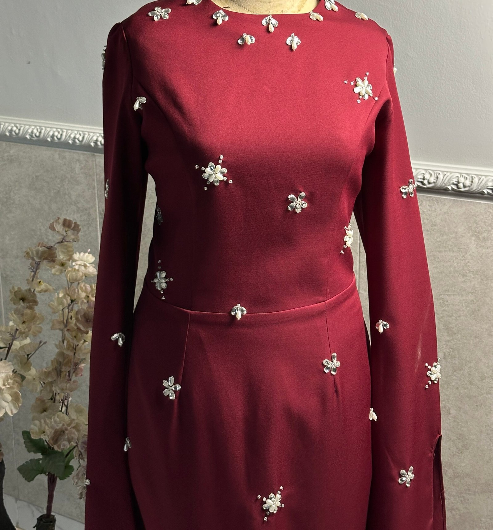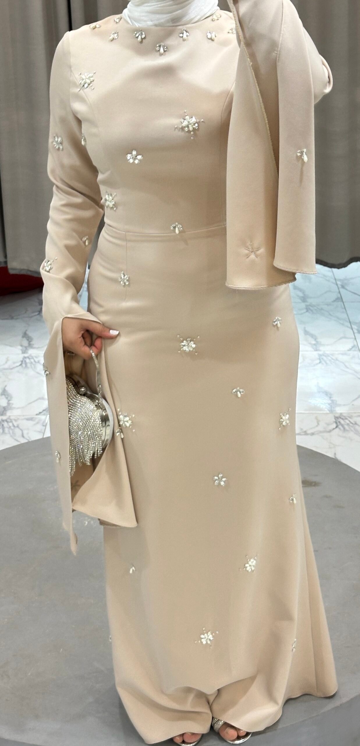 An elegant handmade evening dress adorned with delicate pearls, designed to reflect timeless femininity and soft luxury